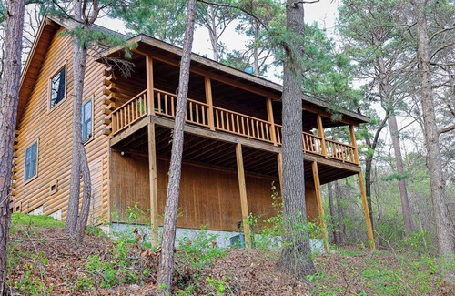 *New, Affordable Luxury, all Logs, Pine flooring, Pine walls and Pine Ceiling---no drywall *Super LOW Rates!!!*HEAVY VAULTED BEAMS 23' High*Huge 7' x 7' Log Chandelier! *2nd story has 14' High Roof * Private bedrooms with bathrooms!*Sleep up to 8 adults, kids * Large 2-3 person Jacuzzi in Private Bedroom Bathroom *Pet friendly: 3 pet max*5' Inside Balcony with chairs & table for privacy*600 forested acres in back* "Bird Sanctuary" with Fountain & Bench to enjoy !*Huge covered Porches w/ rockers/chairs in back with Picnic Table. * Out where the Coyotes howl & the Hoot owls hoot. Lots of Carolina wren & Cardinal song. And were the Woodpeckers peck*Deer, Bobcat and Bear sightings.*This Cabin has 23' down stairs and 14' high roof instead of ceiling *Fully stocked Cabin: pots, pans, towels and toiletry*15 minutes to Branson Shows*Top of the Rock- 4 miles* Beaches (3), parks (2), Marina- 5 minutes *Dogwood Canyon with Elk and Bison viewing- 15 minutes away *Easy entrance and wheelchair accessible on 1st Floor *PARKING: Plenty of Boat or Pontoon parking, (Tournament Fishermen love it!), truck, car, wave-runner on a level all-weather surface. Wheelchair Entrance. Handicap Accessible on 1st Floor with beds & Bath.*Washer, Dryer, Laundry soap & Bleach. Easy entrance for just about anyone and *Home Made Hot Process Lye Soap, 2 bars provided in your Cabin!!! See more in our Office Store! Currently, 10 fragrances, at $3.50 /bar. (Prices subject to change)* Ask about Pontoon boat rides (10 - person) complete with life preservers!. We welcome Pets and there is a Pet Fee. This fee varies year to year so view this at checkout.