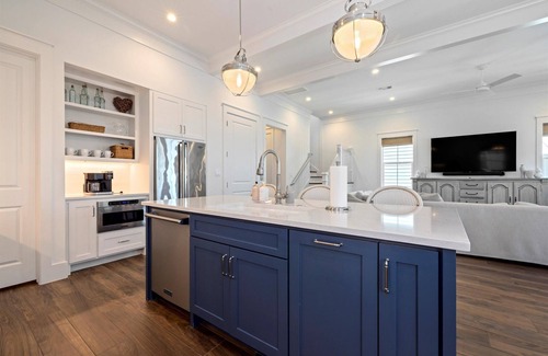 Welcome to "Beauty & the Beach", nestled in the beautiful neighborhood of Beachtown, this gorgeous 4-bedroom, 4-bathroom vacation home is just steps away from the sandy beaches of Galveston. There are two additional bunk alcoves, one featuring one full bed and three twins, and the other featuring two twins.