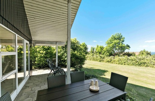 The holiday home has a covered west-facing terrace with sea views and an east-facing terrace with morning sun. The spacious adjoining lawn offers plenty of room for both kids and adults to have fun with games, a bonfire, and ball sports.