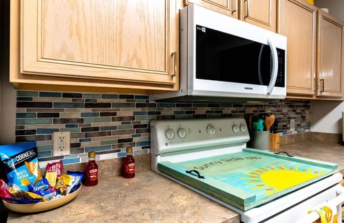 The kitchen is a true delight for any culinary enthusiast, equipped with all you need for your vacation and ample counter space. Whip up delicious meals and gather around the dining table to savor them together. The dining table seats 6 and there are also 2 bar stools at the counter, so you can entertain while you prepare a meal!