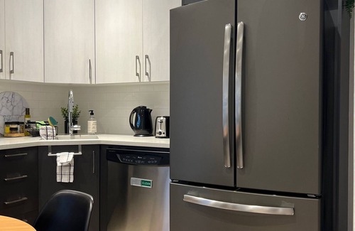 Enjoy a private balcony, a cozy living room with Netflix & Disney+, and a fully equipped kitchen. The elegant bedroom features a large comfy bed for a restful stay. Free parking & on-site laundry – Ideal for any stay.
