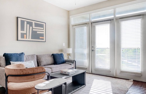 This furnished apartment is located in Mueller, a contemporary planned community just east of the University of Texas-Austin campus. The neighborhood is home to newer mixed-use developments and office blocks as well as many bars and restaurants. Families love The Thinkery, a children’s museum that features activities geared towards kids of all ages. Mueller is also home to 30-acre Mueller Lake Park, the perfect place for a jog after work or a picnic on the weekend on the banks of the lake. The park also hosts a farmer’s market on Sundays next to a splash pad and sand volleyball courts.