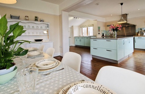 A stylish, spacious 5 bedroom holiday home, sleeping up to 10 guests with sea views, stunning terrace for al fresco dining and lovely lawned gardens for everyone to enjoy. This wonderful property is close to the beach & the village amenities. A great holiday space to suit the whole family!