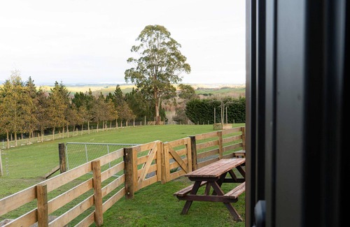 Bruce Farm Alpaca Cabin 3 by Tiny Away in Hillend is just 45 minutes from Dunedin. It presents a charming, tiny house experience overlooking alpaca-filled paddocks. During birthing season, guests can see newborn cria while taking in views of Balclutha and Kaka Point’s lighthouse at night.