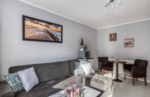 The apartment features a warm living room with a wood stove, flatscreen satellite TV, DVD player, and a comfortable seating area. The open kitchen is fully equipped with ceramic and electric stoves, coffee machines, oven, microwave, and fridge-freezer. A spacious bedroom with a double bed and a modern bathroom with shower and hairdryer ensure a relaxing stay. Enjoy the private terrace, fenced garden, barbecue (on request), and electric car charging post. Central gas heating and insect screens add to the comfort.