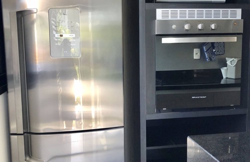 Integrated living room with double height and 3m, reclining and retractable sofa, equipped with 49 "led TV, Sierra round dining table with 6 chairs; American kitchen with everything you need: electric oven, microwave, electric cooltop cooker 4-burner, dishwasher, 422L Inverse refrigerator, blender, mixer, grill, household items, porcelain, crystal, water purifier, clothesline, laundry room with washing machine, iron, gourmet balcony, electric grill, minibar, table with hardwood, private pool with water mirror, sun loungers and umbrelone Saccaro in the private pool area. Two car spaces per bungalow.