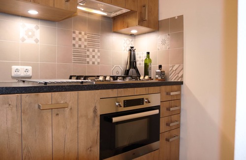 The kitchen is equipped with a combi oven, a dishwasher and a fridge.