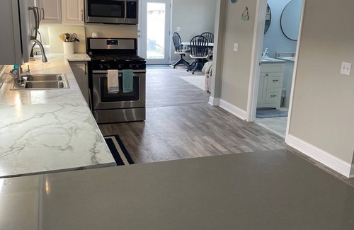 2025 POOL SEASON: MAY 3-SEPT 30. NOTE: THIS IS A SEMI PRIVATE POOL SHARED ONLY WITH OUR OTHER UNIT DIRECTLY BEHIND. POOL IS FOR GUESTS ONLY, NOT OTHER FRIENDS.Heated, 14x28 in-ground, saltwater pool! HOT TUB: 8 person spa with a new 42" TV mounted under the covered area for super cool enjoyment while in the hot tub! 3 bedrooms, 1 bath 1,200 sq ft lower unit. The rear yard of this is a nice, grassy area that adjoins the awesome pool deck. 2 back yards for your enjoyment! Tiki bar, gazebo, gas firepit, Bocce ball, corn hole too. 3 nice sized bedrooms with new Roku Flat screen TV's, large bathroom, double vanity, washer / dryer, & more! Bedroom 1; king, Bedroom 2; queen, bedroom 3; 1 queen, 2 twin beds, all new Roku, flat screen TV's. This property, "Buoy House" is basically a less expensive back door to our other home, the "Round House" with the awesome pool deck but with this unit you have a hot tub too. NOTE: The pool is for paying guests only, No friends of guests as it is semi private. This keeps the crowd down, we have no issues, everyone gets along and enjoys each other. Afterall, hotels have sometimes 50 rooms with one pool. It works well.