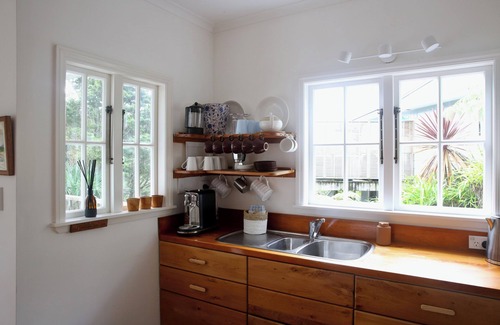 The combined kitchen/dining is great for the whole family to socialise and cook together. It also leads out onto the wrap around veranda where you can relax in the sun on the outdoor couch and listen to the Tuis in the native bush. The kitchen is very well equipped so it really feels like your home away from home.