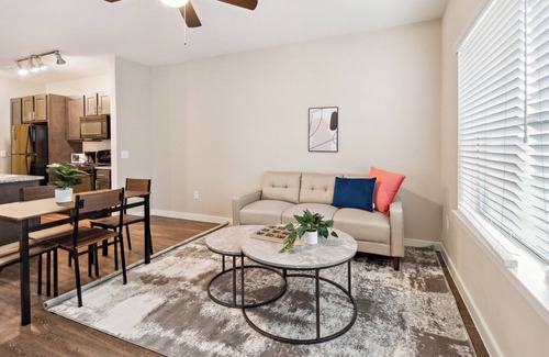 Relax in the spacious living area, featuring modern furnishings and sleek vinyl plank flooring.
