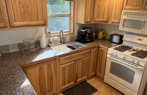 Cook up a storm in the spacious kitchen, featuring a gas stove, large countertop space, microwave and counter-depth French door fridge. Whether you’re using the drip machine, mini Keurig, or French press morning beverages are prepared your way. With ample counter space and all essentials provided, guests love creating meals here. Plenty of pots, pans, tools and sharp knives! 2 barstools provide a place to eat your meals.