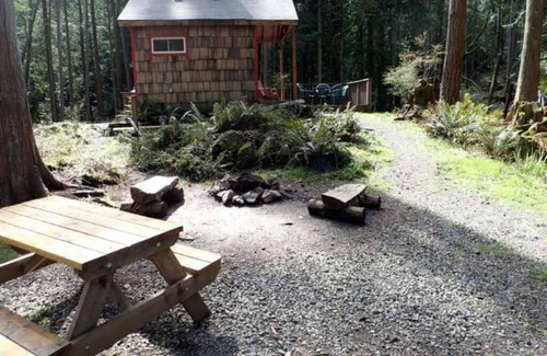 This is what people are talking about! Located on a small hill above Jordan Creek, this cool cabin has an outside deck overlooking the creek and surrounding forest. A perfect place for a getaway for a couple or a few friends. Cool LED lighting, clean and crisp décor. This place offers a refreshing yet rustic accommodation. This willl meet anyone's demand for rest and relaxation. It has all the amenities, new pit toilet with interior LED lighting, private outdoor propane insta-hot shower and totally cool adjacent tent site with water, picnic table and fire circle. Located in a stand of recently thinned 80 yr old firs and backed by the stunning vertical cliffs of Deer Mountain. This place is a must see.