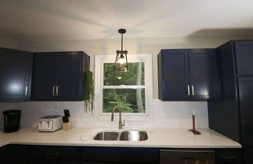 Set on 5 acres, Chalet Getaway is a cozy yet spacious cabin surrounded by stunning nature and lake access. The main area features giant sparkling windows, a tall ceiling, and an electric fireplace. This Hocking Hills destination is perfect for romantic weekends, self-care retreats, friends' trips, and family celebrations. Disconnect from the world or stay connected through our Starlink internet.