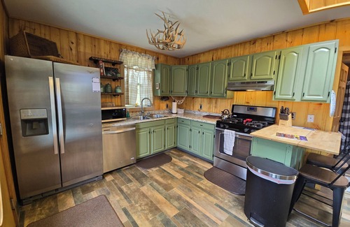 The cabin offers essential amenities for a comfortable stay, including a washer and dryer, a luxurious soaker tub, and an impressive fire pit, inviting you to relax in the mountain serenity.
