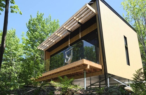 This cabin, on the backside of Mont-Orford Park, is situated on the immense 1000-acre Vertendre forest playground. This protected, private territory offers 2 lakes and a mountain where you can enjoy a wide range of outdoor activities right on the site. A perfect balance between ecology, innovation, and comfort.