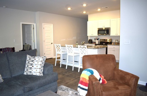 Step into a cozy, modern retreat where a full-size sofa, loveseat, and a plush suede armchair invite you to unwind. Two windows provide natural light with a view of the tranquil wooded setting. Open to both the kitchen and dining area, this cozy area features a soft area rug, 65” Smart TV, and a bluetooth soundbar to add to your viewing experience or stream music from your personal device. Perfect for movie nights or quiet moments, this space blends comfort and style effortlessly.