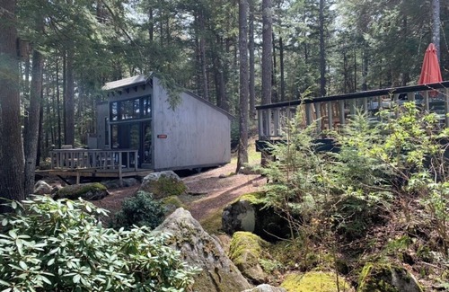 This custom Scandanavian-inspired camp at the end of the cove is designed for individual rejuvenation + group fun. Nestled among hemlocks, pines and mossy glacial rocks, it has private access to 400 feet along pristine Long Pond, with stunning multi-tiered decks. Kayak, canoe, water ski or just sit and read a book. There's a masterbedroom and 1/2 bath and a private deck, 2nd bedroom with 2 twin beds, and loft with a double bed. A private bungalow can sleep up to four (queen bed + sleeper couch). There are 2 large decks for entertaining. Indoor and outdoor dinning for 10 people, with a fully stocked kitchen.
