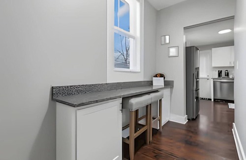 You enter the house from the front door and you will notice that you are in a living room with new furniture - couch and recliner - and a sizable smart TV. Walking through the living room you will pass two bedrooms that have very comfortable beds in them, as well as spacious closets for your storage. In the hallway off the bedrooms and eating space or work station has been designed with tasteful granite countertops and stools for you to work from.