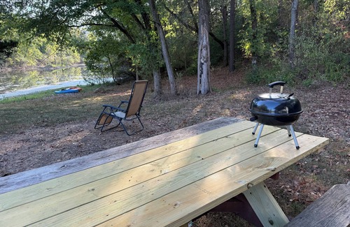 Camper in country setting beside water, near Burning Star Wildlife area | RV Rental in Elkville