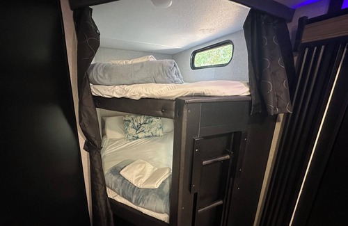 Get away from it all when you stay in this unique gem. This RV sits right before the walkway of the bay, in a quiet space. Equipped with a queen sized bed and two twin bunk beds with a living area separating the two.