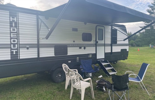 Our camper was brand new last year and has only been used a couple of times. Queen bed in the front with a memory foam mattress. Full size bunk beds in the back. The table and couch make additional beds. Dishes and utensils included. Camper has one large slide out making it roomy for a family. Fireplace, heat and AC. Outdoor seating area includes a picnic table, camp chairs, propane fire pit and a Cornhole set. 7 minute drive from town and grocery stores. Many multi use trails nearby that allow horses, bikes and ATV’s.