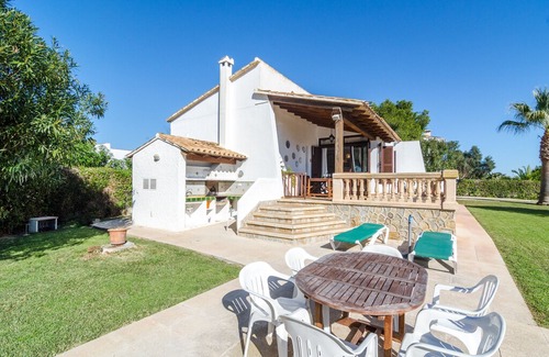 Set close to the beach in Cala Anguila, this beautiful house offers accommodation for 6 people.The exteriors are wonderful. There is a spacious garden where your kids can play and a 11 x 5.5 m chlorine pool with a depth ranging from 0.9 m to 1.8 m. By the pool, there is a terrace with BBQ where you can cook outside. Furthermore, there is a furnished porch and sun loungers. This property offers accommodation on 185 m2 and one floor. There are two bedrooms with one double bed each and one bedroom with a trundle bed. One double bedroom has a shower bathroom en-suite. Furthermore, this house features one bathroom with bath tub. If you travel with a baby, we can supply one cot and one high chair. Enjoy long table-talks with your friends or watch a film on the satellite-TV in the comfortable sitting-dining room. There is A/C in all bedrooms and in the living room. In the kitchen with gas stove you will find everything you may need to cook up a feast. Additionally, you will have access to a washer, an iron and an ironing board. Cala Anguila forms part of the urbanisation Porto Cristo Novo and it is situated 3 km away from Porto Cristo. Nearby, there are lots of lovely sand beaches like Cala Anguila, Cala Millor or Porto Cristo. In Cala Millor and Cala Ratjada you can go out all night long and enjoy good music and cocktails in one of the pubs. Porto Cristo is famous for its caves and the subterranean lake Lago Martel. By car you can explore the whole East Coast and discover charming fishing villages, colourful harbours and small bays.Consult the advertiser for possible charges. Pets up to 5 kg are welcome. The holding of events is not permitted. There is covered parking space for 1 car. Distances: Beach: 0.24 km - Cala Anguila Airport: 63 km- Son Sant JoanGolf course: 19.8 km - Son ServeraTown: 0.01 km - Cala AnguilaTrain station: 14.1 km- ManacorBus stop: 0.95 km - Passeig Diego VelazquezFerry: 71 km - PalmaHospital: 15 km - ManacorTourist license: ETV/3291The Ecotasa (tourist tax) must be paid cash on site when checking in. The amount varies between 0.55€/night and guest during the low season and 2.2€/night and guest during the high season. The tax is reduced by half from the 9th day of your stay. All guests have to pay the Ecotasa, except people under 16 years. You will have to pay the deposit amount at the arrival to the owner. Reference: BN1112958