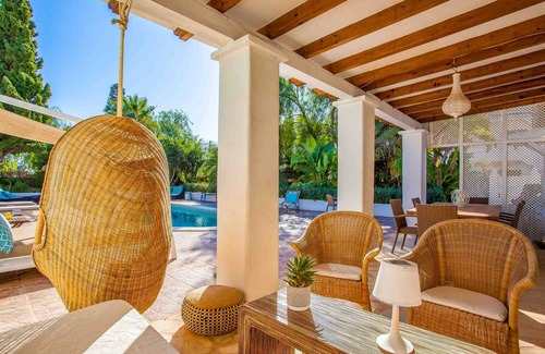 Lovely ibizan house recently renovated with exquisite style, located in the heart of Sant Jordi, 10 minutes from Eivissa city and airport, 5 minutes from Paya den Bossa and Las Salinas. Just 200 m away, you will find restaurants, supermarket, pharmacy, banks, wellness center, bus & taxi stations.The villa is a typical Ibizan finca completely renovates with a modern decoration and a mix of baliness and Scandinavian style. It has 4 bedrooms with confortable beds and 2 spacious bathrooms. Besides the villa has a full equipped kitchen and a brigth living room and dining room.Outside you will find a big swimming pool HEATED so it is perfect to enjoy during all year! Also the villa has a jacuzzi surrounded by beautiful gardens.