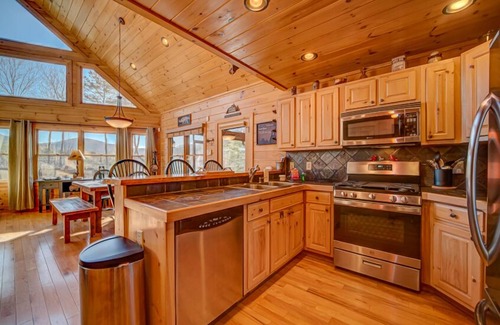 Every bedroom offers a cozy atmosphere with quilt-covered beds, each on a separate floor for added privacy. Upstairs, in the master king bedroom, you'll have your own private screened-in sitting deck. Settle into a rocking chair and gaze out at the stars, which you can also see through the bedroom's large “cutout” offering a wonderful view through the home's prow windows to outdoor vistas. You'll also have sweet dreams in the main level's king bedroom with its warm country charm. The kids will love having a sleepover downstairs in the bear-themed bedroom, with a king to snuggle up in. And for even more sleeping options, there is a futon and even a queen size cabinet bed in the lower level game room!