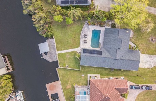 The entire house and pool, along with the dock on a canal.