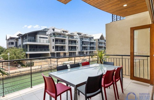 Could this property get any better? What a location! Everything is within walking distance. You’ll hardly need your car during your stay. Modern with a European flavour, this mews property sits between a quiet street and the canal, on a small residential spit in the heart of Mandurah.