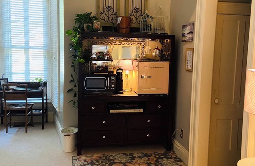 No Kitchen or shared inside spaces. There is a mini fridge, microwave and Keurig coffee maker. The guest book is filled with restaurant information, so many walkable options.