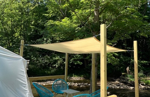 A full-size fold down couch and a twin air mattress in included. Fans and a heater is provided for comfort. Outdoor hot water shower, sink, and composite toilet near tent. Picnic table, gas grill, and hammock are provided alongside the creek. Fire pit with outdoor seating, firewood, and roasting stick provided.
