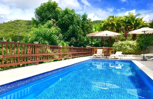 Treetops Villa is set in the beautiful Marigot Bay. The Carambola suite is newly built with all the modern fixtures to make your stay relaxing and stress free, a large dinning and sitting area ,fully fitted kitchen with dishwasher,washing machine,oven and hobb .A smart tv .2 bedrooms with ensuit shower rooms and separate wc.The whole apartment has bye folding doors on to a large balcony with views of the bay and out to the Caribbean Sea.We have a salt water pool for your use with sun loungers and a small bar with honesty book.