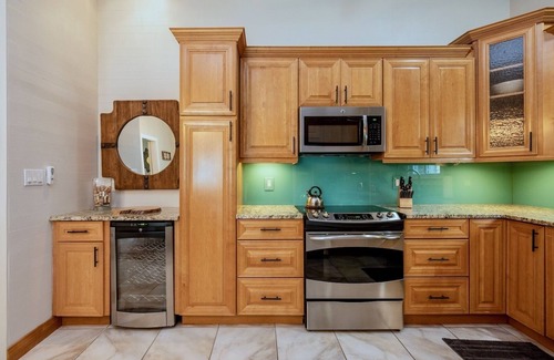 CASA AMARILLA has a comfortable living area featuring a large flat screen TV and double French doors that open right up to the tranquil private pool area. The fully-equipped kitchen includes all of the comforts of home, with plenty of counter and cabinet space. There is a six-person high-top dining table located just off the kitchen, so everyone can sit down and enjoy a meal together.