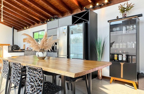 The house has a large gourmet area, equipped with a complete kitchen and all the necessary utensils. You will find a parrilla grill, wood burning stove, pizza oven and an industrial stove, as well as a beer maker to keep your drinks cold. The living room is spacious and welcoming, with a fireplace for cooler nights and an overhead projector where you can watch movies or enjoy the day to the sound of your favorite music.