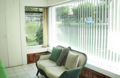 En Santa Fe (Xochitepec), Morelos, en condominio, para 3 familias, con hermosos jardines, alberca, terraza con asador, sala, comedor, estancia de tele, 3 recámaras amplias con baño, totalmente equipada, ambiente familiar y muy tranquilo. Incluye internet, vajilla, sábanas y toallas.