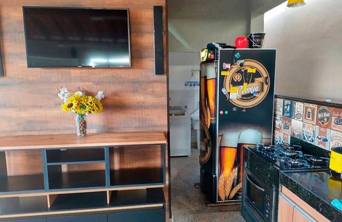 - Cozinha equipada com fritadeira, fogão, forno, geladeira, liquidificador, micro-ondas, torradeira e todos os utensílios necessários para suas refeições