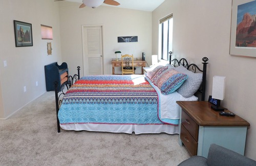 Entry to the guest house is through a courtyard that is shared with the primary residence. Once inside, the guest house is situated for privacy, so that all the large windows face away from the main house and look into private guest house yard. This is a very comfortable and well appointed property in a great foothills location close to Sabino Canyon, the Loop bike path, as well as many shops and restaurants including Whole Foods.