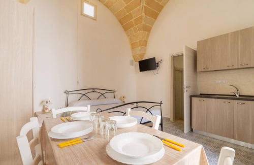 The renovated studio apartment accommodates 2 guests on holiday in Salento, in the old town centre of Veglie, a small town that is 10 minutes` drive away from the beaches of Torre Lapillo.