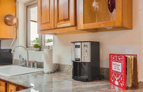 • Fully equipped kitchen with cast iron pans, Dutch oven, coffee maker, crockpot, and more