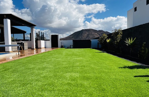 Casa Leila - A private luxury villa, available to rent in the upmarket Faro Park area of Playa Blanca! Less than 30 minutes drive from Lanzarote airport, 5 minutes drive from Playa Blanca town centre and 5 minutes walk from the sea front promenade which spans the coastline from the Lighthouse to the Marina Rubicon. Casa Leila is located within the upmarket Faro Park residential area of Playa Blanca, a quiet and peaceful place within a 5 minutes walk of a variety of local shops, restaurants, cafes and small bars. Enjoy spectacular views of the famous Montaña Roja, while you sit back, relax and enjoy a well-earned holiday. The main bedroom has a king-sized bed with memory foam mattress and the second bedroom has two single beds with memory foam mattresses. Both bedrooms have built-in wardrobes and shuttered windows, enabling the rooms to remain cool and provide a darkened sleeping area if required. Luxury Egyptian cotton bath towels are provided for guests' use. Beach towels are also provided. A private, heated, swimming pool and also a large hot tub is located to the rear of the house and is set in a private, walled garden. A key-operated safe is provided free-of-charge, to keep your valuables secure. Free WiFi. Free UK & EuropeanTV package provided (including BBC, ITV, sports and movie channels), together with a small variety of international channels. There is a private parking spot to the front of the villa. Casa Leila has everything you require to make this a perfect 'home-from-home' in a peaceful and tranquil setting!