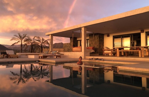 .5 mile to the beach with all the restaurants and people. VRBO cannot seem to get this right and unfortunately doesnt show where I am on the map. I reccomend looking up Cerritos beach inn and that will give you an idea because i am a stones throw from there.Another nice feature is at night this house feels like a Hollywood hills house but overlooking the lights of Cerritos. The deck with its lit pool and hot tub are fabulous for entertaining, watching the sunset over the ocean or the whales during the day. The lot is large and spacious. 1 acre of agave and cactus.On one side of the house is a massive Maracuya fruit vine.The star gazing from the observation deck is amazing. The outdoor hanging beds are blissful . The property is very serene with the sound of the waves very present.The courtyard with its argentine grill and cactus garden makes for another fun hang out space. The ocean views are from every room. We have boogie boards and surfboards galore. There are four bedrooms, two with kings, one with a king and a set of bunks and one huge room upstairs with four twin beds.If you have more than 12 people , the outdoor hanging beds which are fulls , can be a place to sleep. Also, the living room couch can sleep two flexible people .The pool heats to 80 with our solar system.No the house is not air-conditioned. Very breezy house. Its really not needed unless you are there in the off season months.We have exceptional wi-fi. We also have a nice collection of surf and boogie boards.This house is not open to EVENTS.
