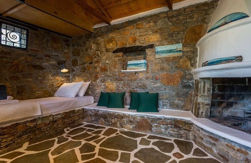 Our land is an olive grove located at 1.3 Km from the Old Village of Alonissos, accessible from a standard 1km non asphalted road that goes down hill. There, stand 3 stone built chalets and a sequence of wide stone terraces with breathtaking views to the Aegean blue and the hills that emerge from the sea, composing a surreal painting landscape. At a walking distance of 650 meters, you find yourself at the quiet beach of Vrysitsa. INSIDE Villa I (47m2 - hosts 3 people) Located on the top of the land, about 50 meters from the other Villa. Villa I consists of two separate rooms: • First room is a studio with a double bed, a separate small kitchen and a toilet; • Second room has a traditional fireplace and a single bed; • All beds are built of stone with very comfortable mattresses; • The wooden roof and the floor made of local stones set a cozy indoor ambient; • Kitchen is equipped for light meals (toast oven and a cook-top). OUTDOOR SCENARIO Enjoy your shower to our outdoor olive tree shower and pause the time at our wide terraces with breathtaking views in the midst of olive trees and cypresses, from which your brasilian hammocks is hanging.