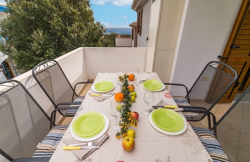 The property is complemented by a spacious terrace offering stunning views of the surrounding greenery and partial sea views. The terrace is furnished with a table and chairs, perfect for enjoying relaxing moments. Additionally, the apartment has access to a large courtyard on the ground floor, ideal for children to play safely and freely.