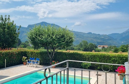 The villa is pristine and spacious, and sits on the edge of a residential area outside of Barga. The property has a private not overlooked garden and pool property has the benefit of fantastic views across fields, with the mountains in the background.