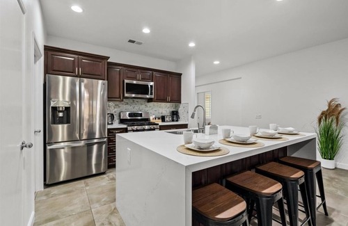 Get ready for a wonderful vacation with the whole family and friends at this Coachella Modern home that has been completely remodeled and thought of every detail to ensure the best vacation for our guest! Just entering the home you will feel at a luxury resort due to our massive hotel resort like pool of over 1000 sq. ft. , with plenty of features for the entire family to enjoy. A twenty five feet tanning self for the kids to play and run while adults lie down and relax, a built-in seven sit table to have your favorite drinks or dinner inside the water! Other amenities that will make your family and friends not to leave the house are a Pickleball court, an outdoor Ping Pong Table, pool table and Putting Green. There are also large turf areas for the kids to run or play sports! When it comes to mealtimes, our kitchen is fully equipped for small quick meals or large holiday gatherings. Make the most of our great weather by firing up the Barbecue grill and savour an al fresco dining experience under the stars. We can't wait to offer you the best resort like vacation to your family and friends!