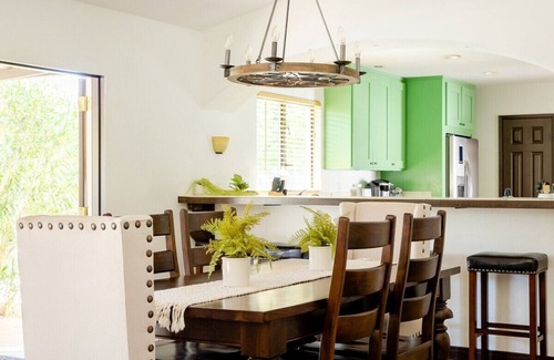 Grab a drink in the vibrant green kitchen, then head out to the pool terrace for a game of cornhole or a stroll around the cactus garden. This Spanish-style home in the heart of La Quinta combines sunny interior spaces with a dreamy backyard oasis.