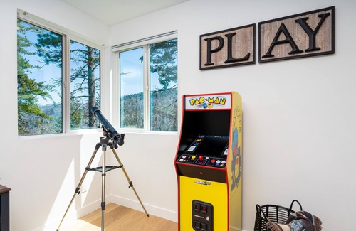 • Game Room: Unwind in the game room featuring a comfortable Pottery Barn Queen Sofa Bed with an upgraded memory foam mattress. The game room also features a balcony, a 55” Samsung Smart TV for streaming, a Pac Man arcade game, and a gaming table with cards, poker chips, and board games provided. Stargaze Yosemite’s dark skies or get a closer look at Cascades Fall on our private deck with our cabin’s telescope or binoculars.