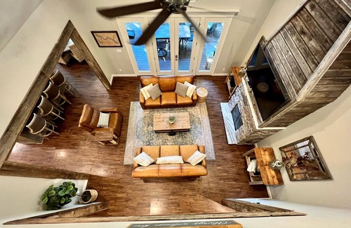 We are excited to share this NEWLY remodeled, 4 bed, 3 bath lakefront property with you. This rustic lakehouse features a fully equipped kitchen. Every room includes a large flat-screen TV with satellite. There are two large decks featuring big-screen TVs, a gas grill, hot tub, an outdoor dining table and chairs with ample seating. Large backyard features a fire pit, charcoal grill, access to lake, boat dock, and kayaks. Located within minutes to popular local attractions! The perfect getaway!