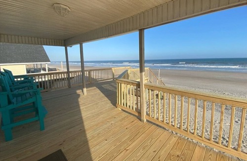 Oceanfront home located in N. Topsail Beach. Panoramic ocean views from the covered porch to enjoy the sunrise and sunset. Cozy and comfortable 2 bedroom, 2 bathroom single level home. Your family can enjoy the convenience of all the linens being provided (sheets, comforters, pillows, and bath towels) and a fully equipped kitchen for a home away from home experience.